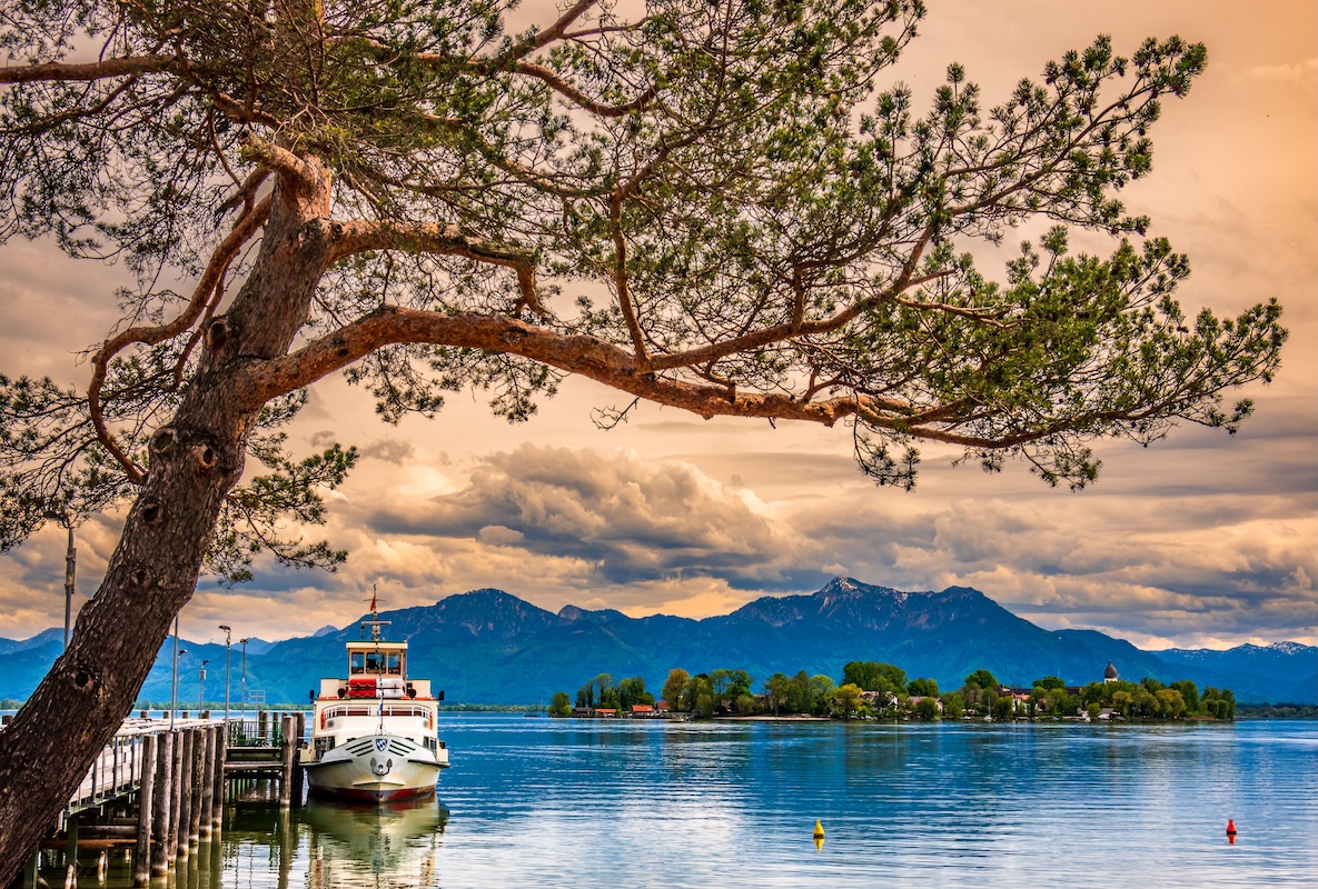 位於巴伐利亞阿爾卑斯山北麓,面積約80平方公里,被譽為「巴伐利亞之海」,是德國第三大湖泊。湖光山色如詩如畫,碧波映照雪峰,氛圍清新怡人。湖中三座島嶼各具特色:赫倫島為最大島,矗立赫倫基姆湖宮;弗勞恩島以修道院與漁村聞名;卡濟島則為無人島。