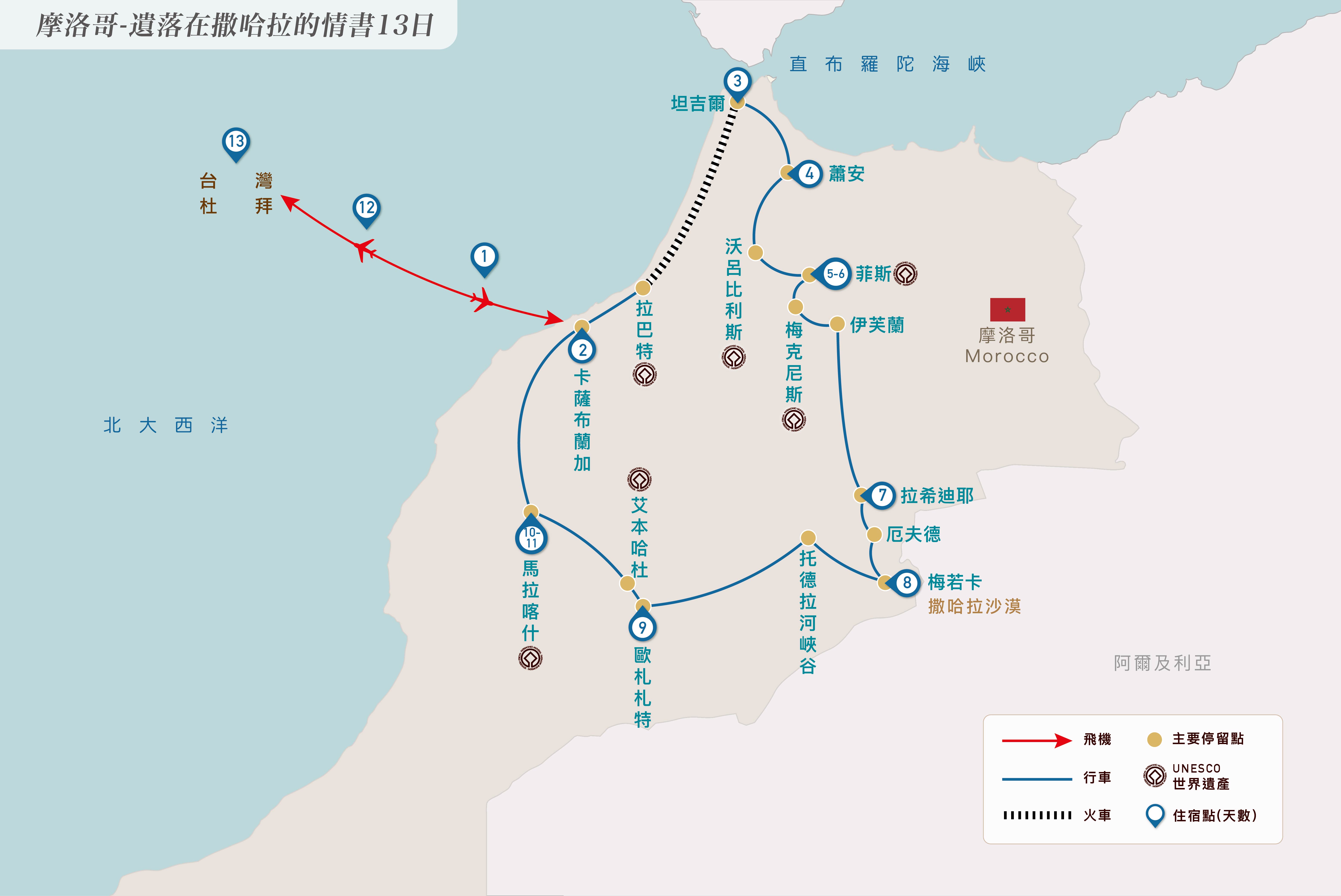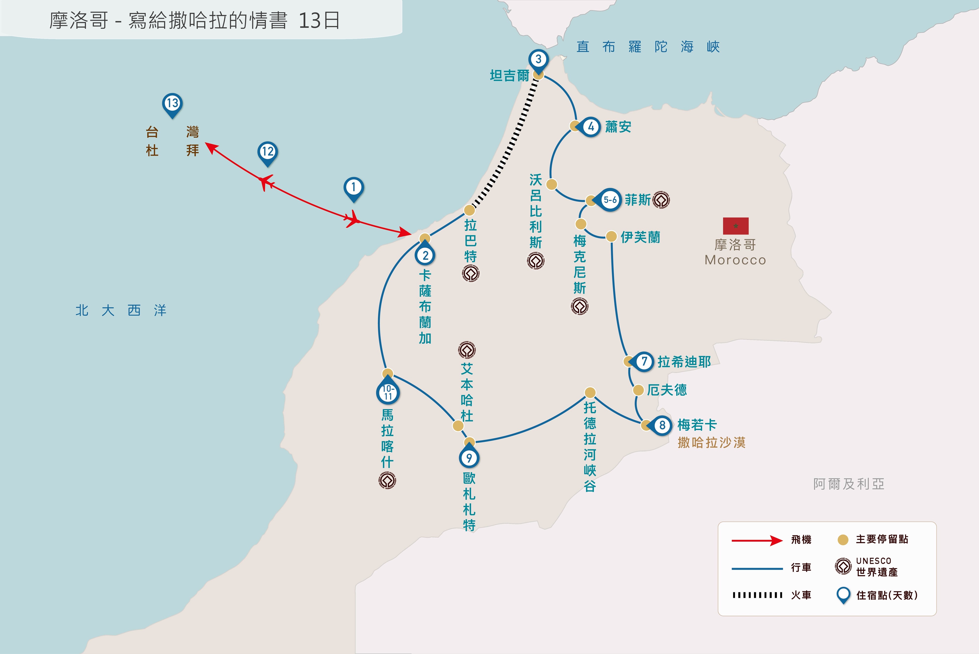 2.明日自拉巴特搭乘高速鐵路至坦吉爾,行李由巴士載送可能較團員晚抵達飯店,如您想要進飯店時先行盥洗,今晚可準備一換洗包隨行。