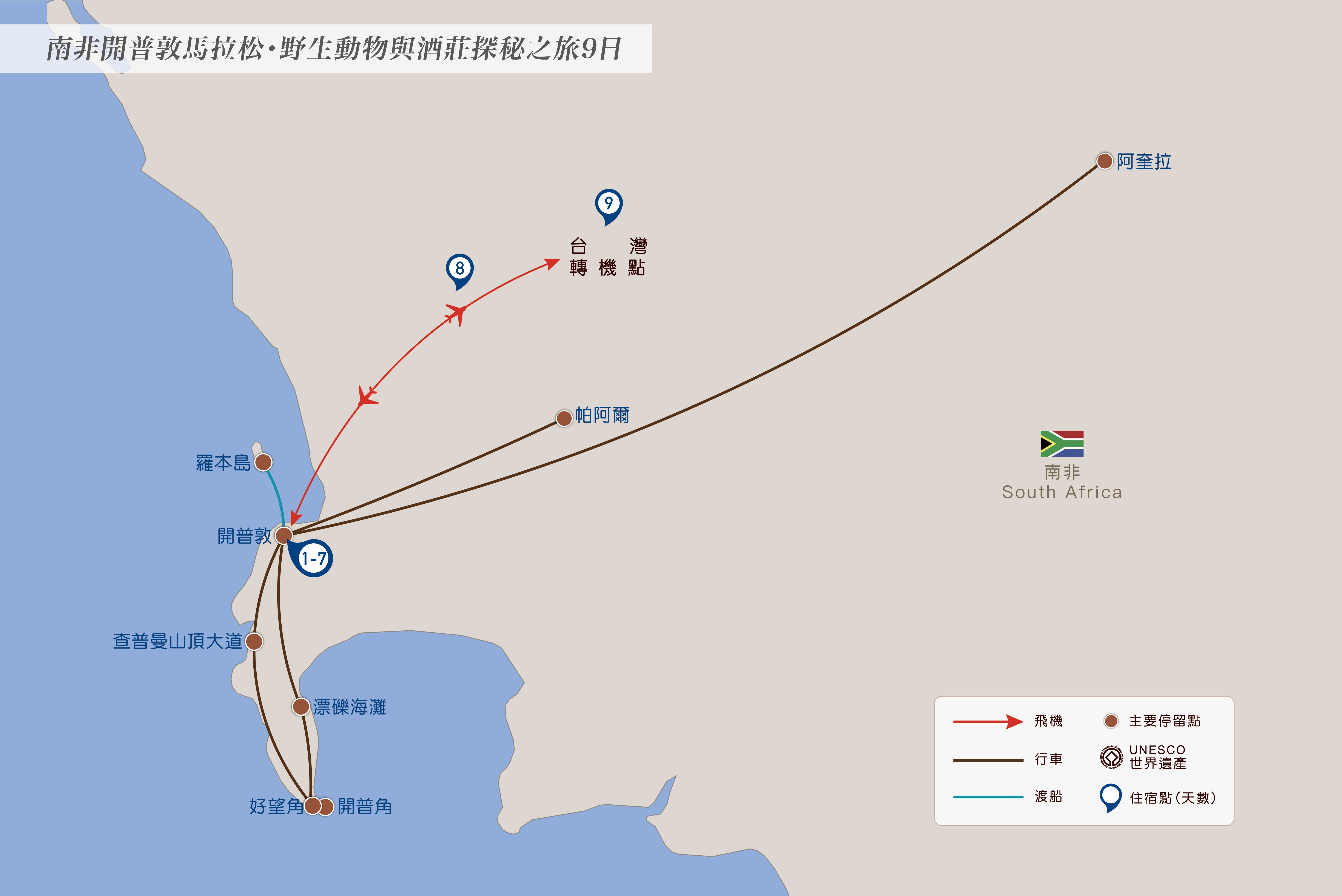 今天,我們搭機前往南非開普敦,展開一場兼具冒險與挑戰的旅程─為即將到來的馬拉松賽事做準備。經過長途飛行,抵達後直接前往飯店入住,這裡將成為賽前放鬆與調整的舒適基地。