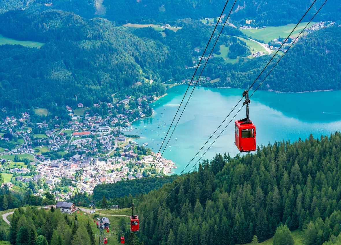搭乘十二角峰纜車緩緩上升時可以從不同高度俯瞰整個沃爾夫岡湖區的景色。 來到山頂遠眺薩爾茨卡默古特和達士坦阿爾卑斯山山脈以及湖泊的壯麗景色。