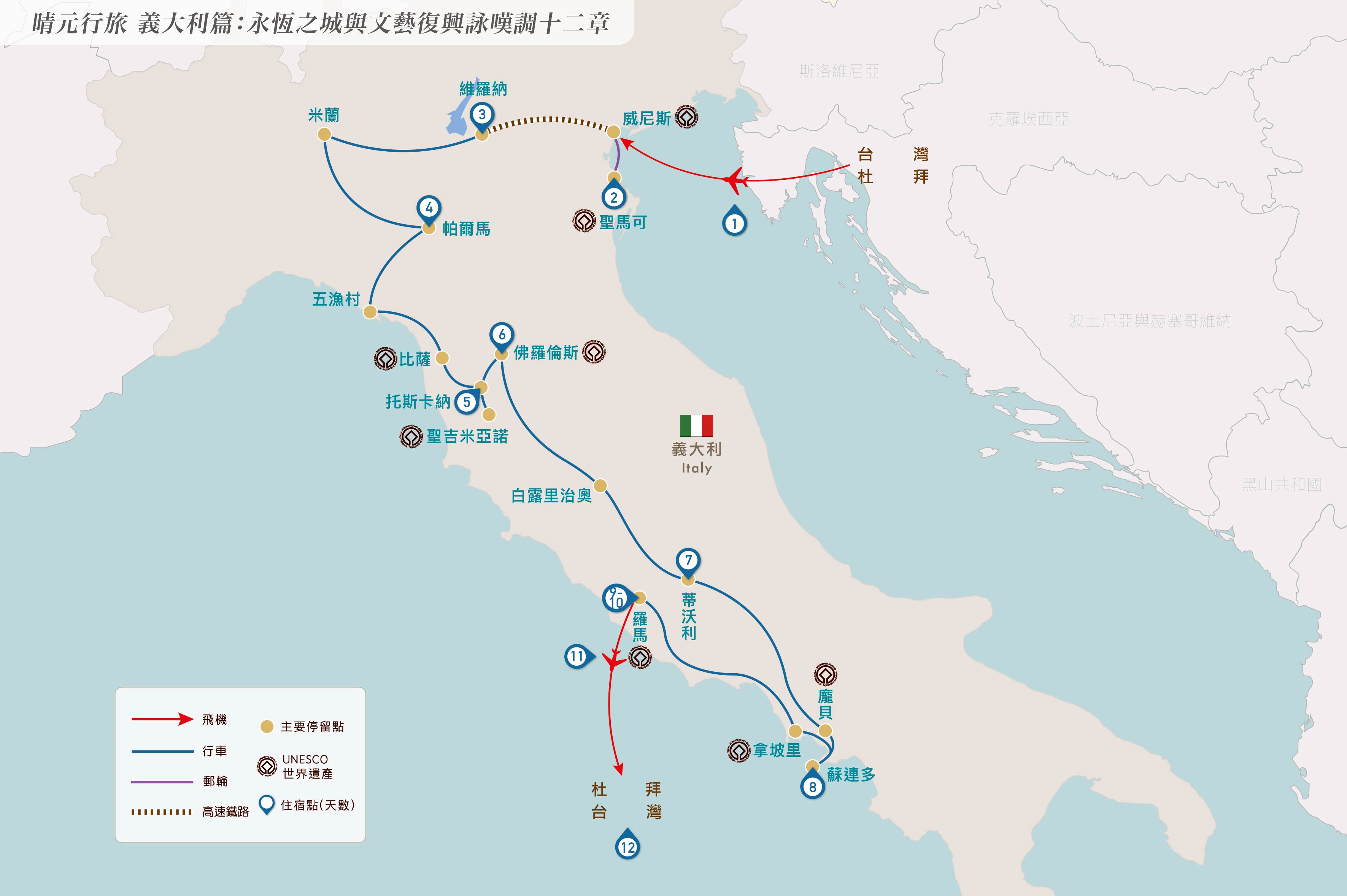 本行程採用阿聯酋航空北進南出航線,從威尼斯進、羅馬出,不走回頭路,大幅節省交通時間。回程安排搭乘晚班機,讓您在最後一天仍有充裕時間悠遊羅馬。此一規劃兼顧行程流暢與觀光品質,讓12天的旅程充分發揮最大旅遊效益,參訪景點更豐富、節奏更從容。