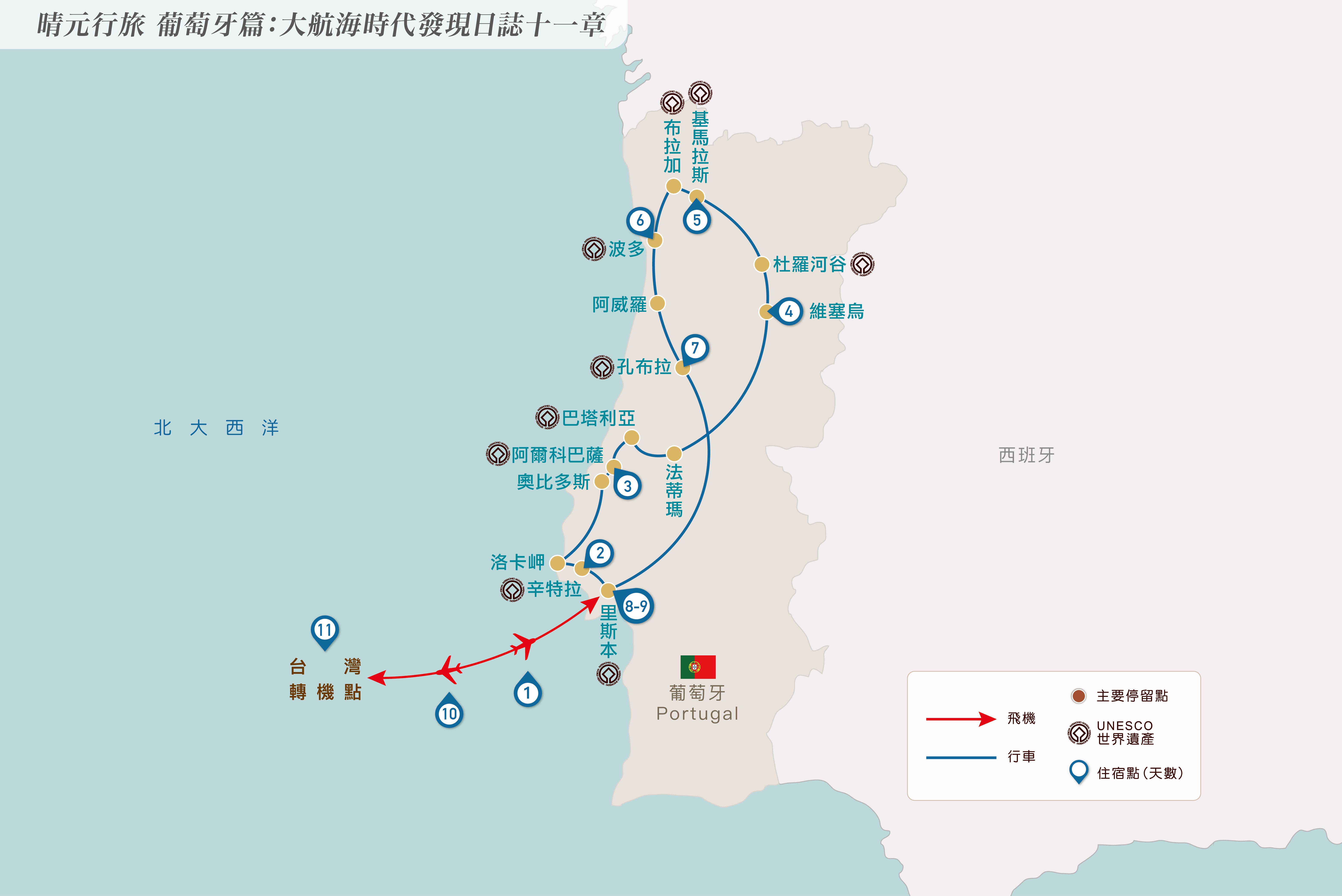 以大航海時代為靈感,從里斯本啟程,走訪波多、杜羅河谷、阿威羅、佩納宮與洛卡岬,沉浸於葡萄牙的風景與文化之美。這段旅程不僅拓展視野,更能夠成為未來探索世界的靈感源泉。