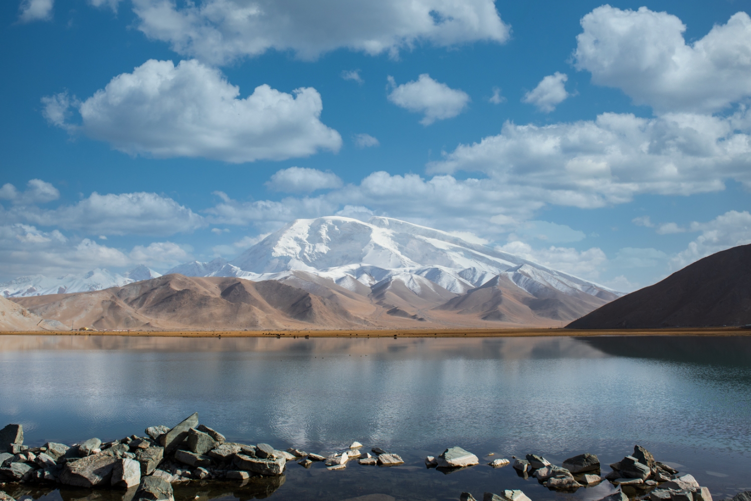 喀拉庫勒湖,位於新疆帕米爾高原克州阿克陶縣,是一座海拔3600米的高原冰磧湖。它被譽為「帕米爾明珠」,湖畔環繞著慕士塔格峰、公格爾峰及公格爾九別峰三座雪山,湖水隨光影變幻呈現深藍、墨綠或淺灰等多重色彩。柯爾克孜族牧民與氈房、雪山倒影共同構成