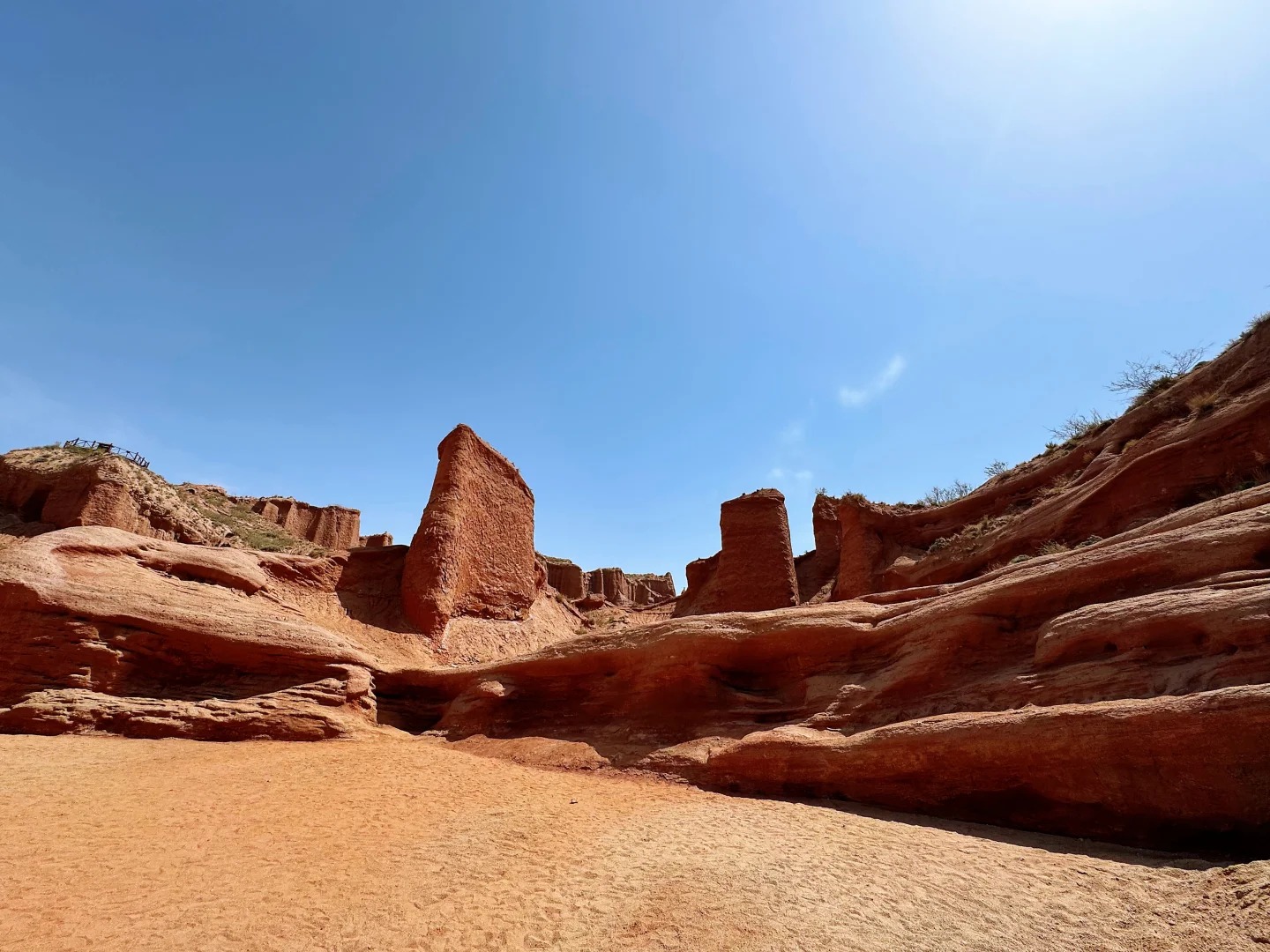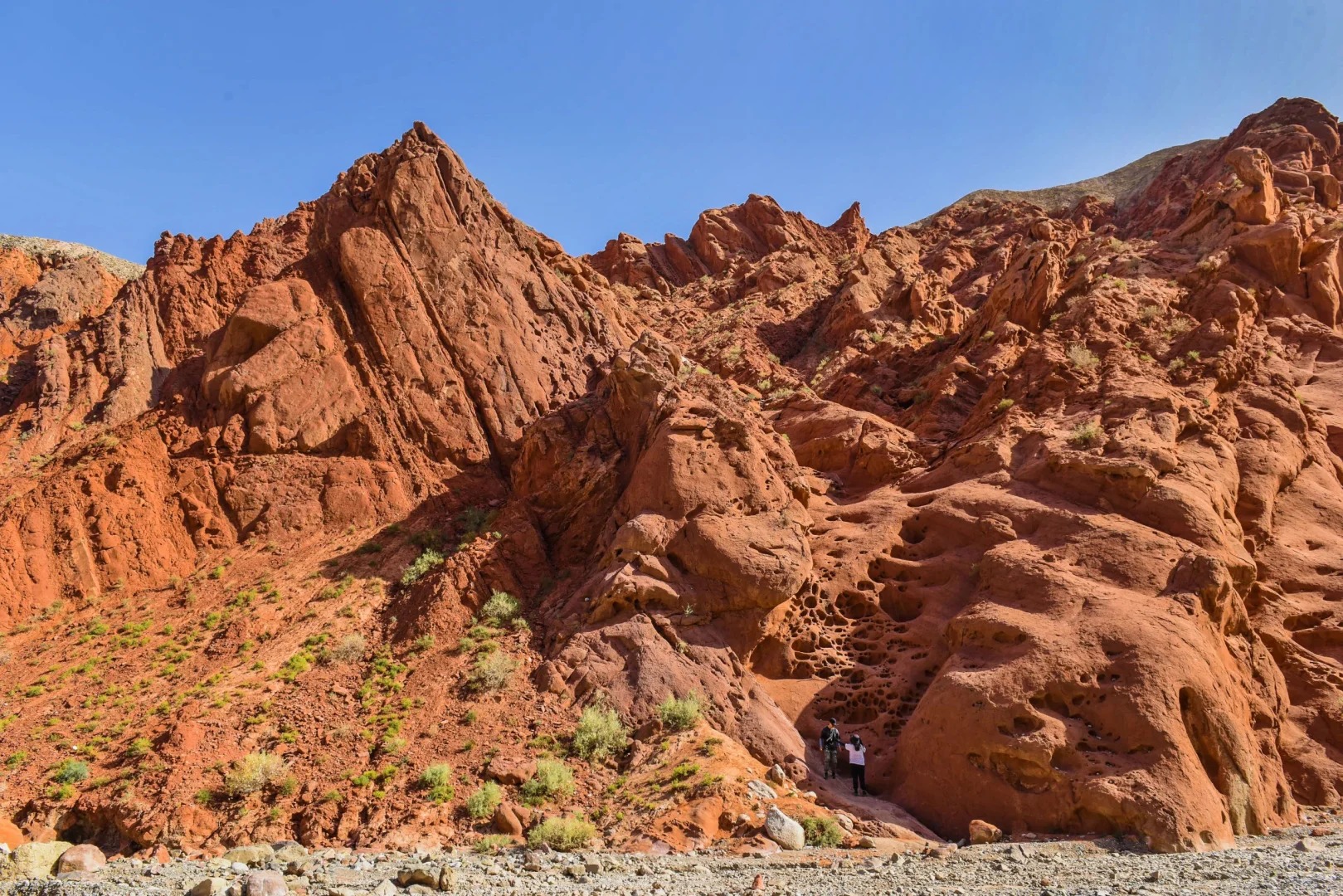 【奧依塔克紅山峽穀】,山體富含氧化鐵等元素,呈現火紅色,在流水和風力的雙重侵蝕下形成獨特的地貌,岩壁上有圓形孔洞猶如氣泡一般,峽谷內的氣泡岩壁是特色景觀,站在山谷中仿佛置身於奇幻神秘世界。