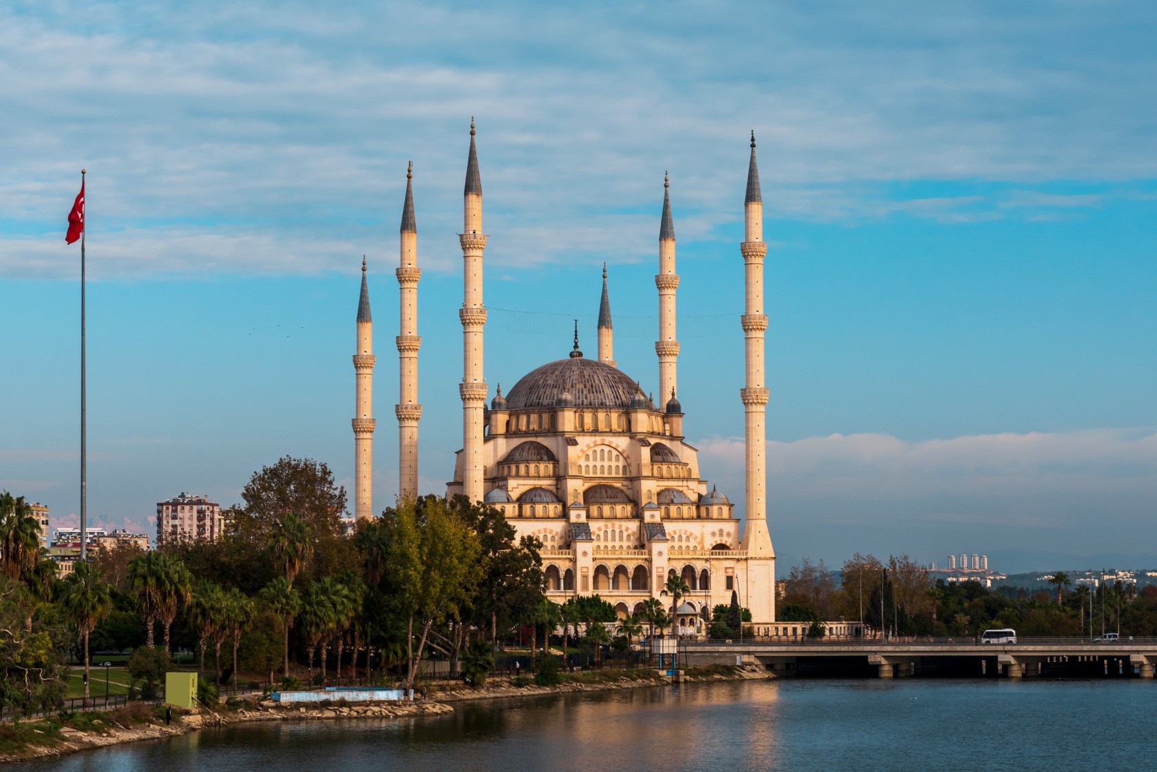坐落於土耳其阿達納(Adana)的薩班哲中央清真寺,是這座城市最壯麗的地標之一。白色的外牆在陽光下閃耀著柔和的光芒,六座筆直的尖塔直指藍天,融合奧斯曼與現代風格,大理石圓頂、彩繪玻璃與阿拉伯書法,共同構築出一座充滿靈性的藝術殿堂。