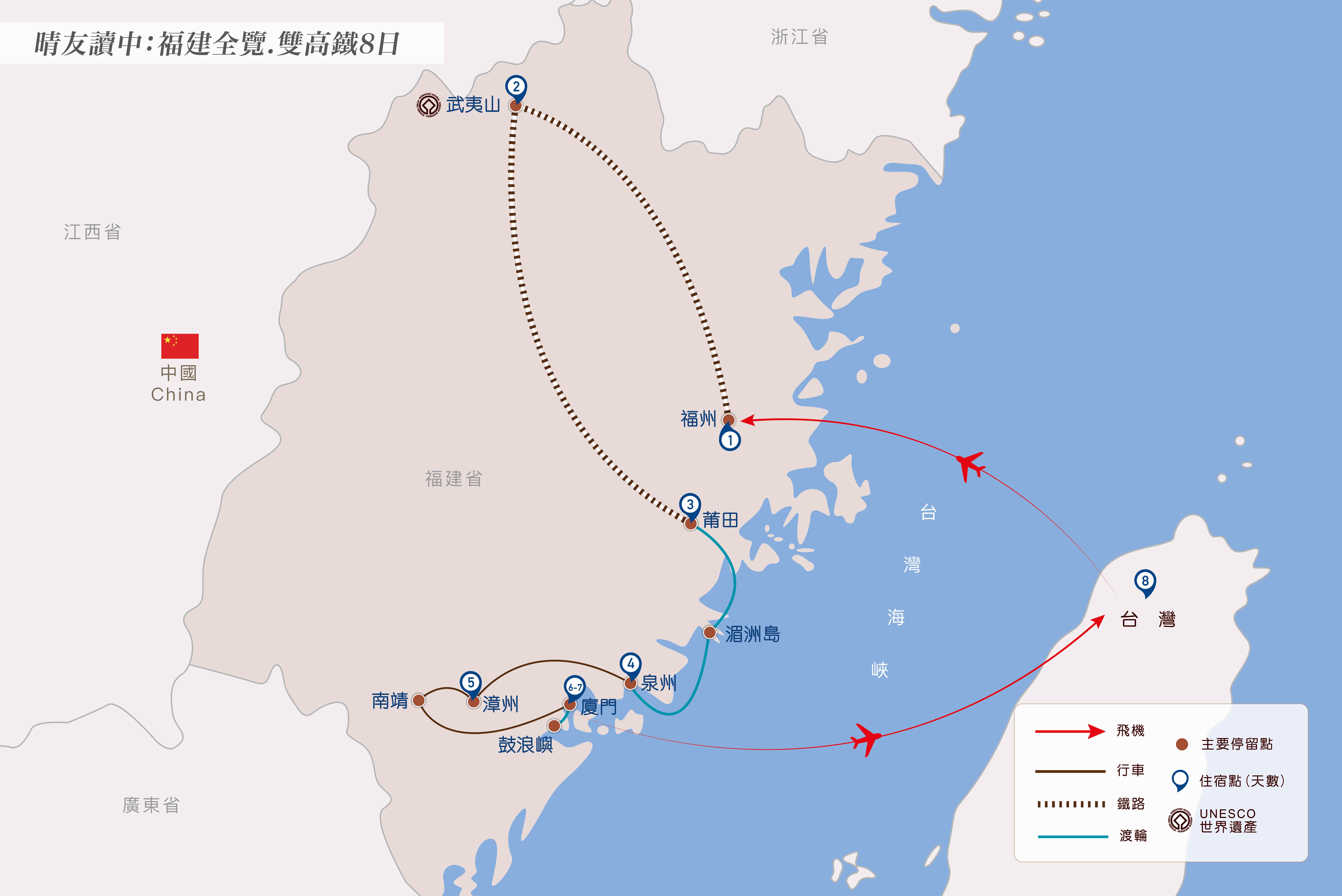 泉州【開元寺、東西塔、西街(品嘗麻糍)、戲鯉茶樓(提線木偶、南音秀含茶品)】-20km-晉江【梧林村落(含★電瓶車)】-113km-漳州【漳州古城、明清古街(品嘗四果湯)】