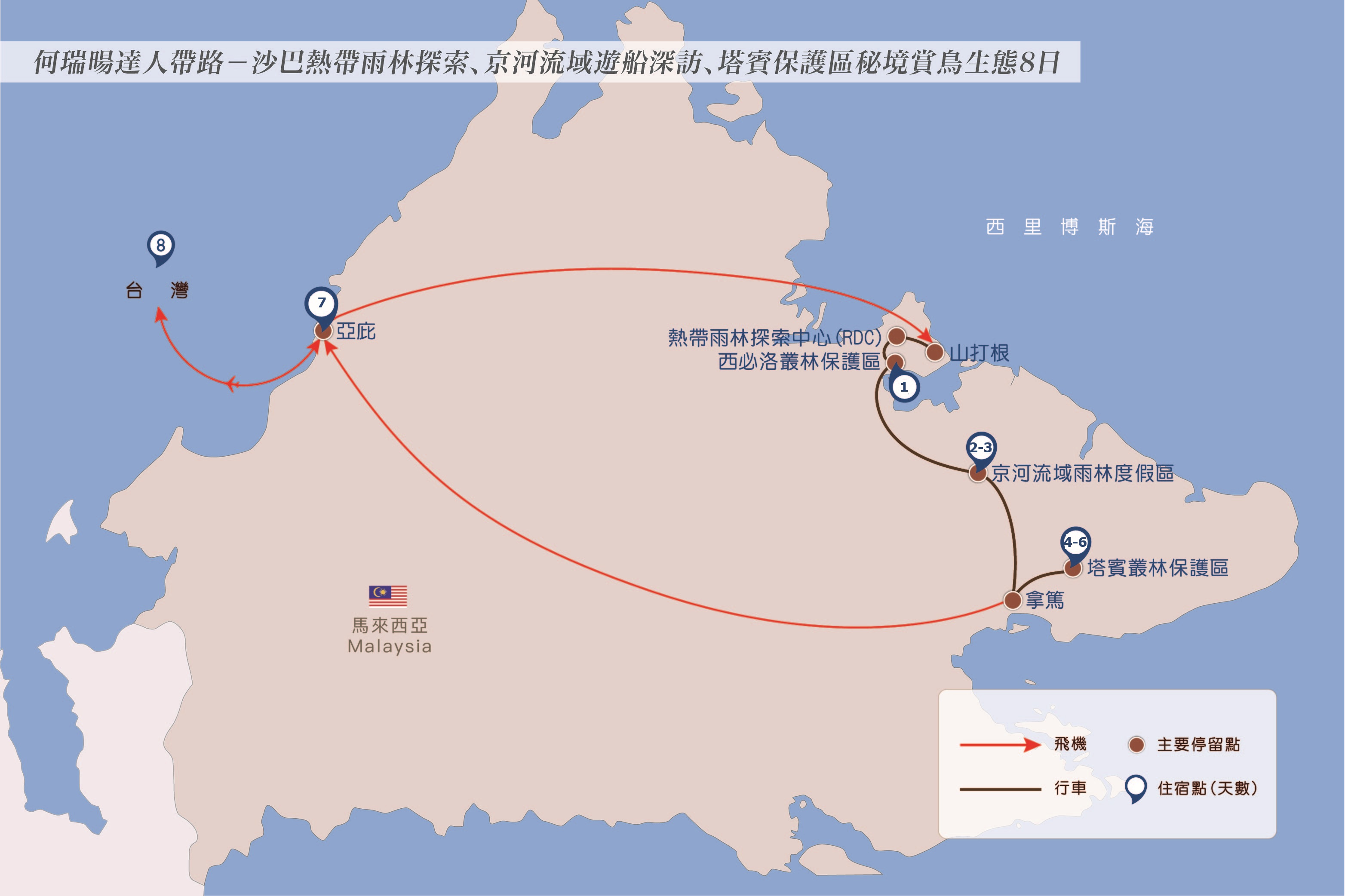 山打根雨林探索中心(RDC)擁有全馬來西亞最長的雨林天空步道,全長 620 米、最高距地面 27 米、寬約 1.5 米,設計牢固、安全,並連接三座觀景塔,從各種絕佳角度觀察野鳥與野生動物。