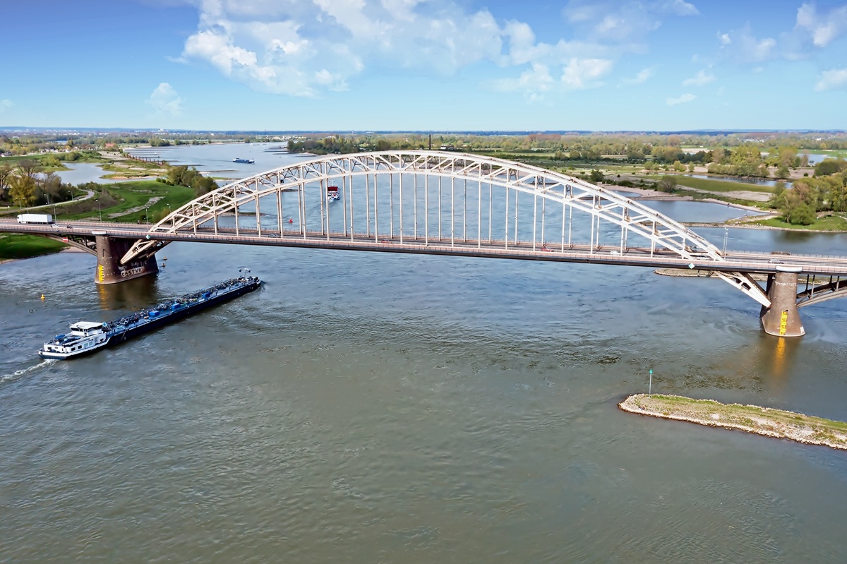 萊茵河進入荷蘭境內後最大的分流,承載了約65%的總水量,作為連接鹿特丹港與德國魯爾工業區的關鍵動脈,它是歐洲最繁忙的內陸航運水道之一,河面上大型貨輪往來頻繁。宏偉的拱形瓦爾橋橫跨歷史名城奈梅亨,構成當地標誌性的天際線。