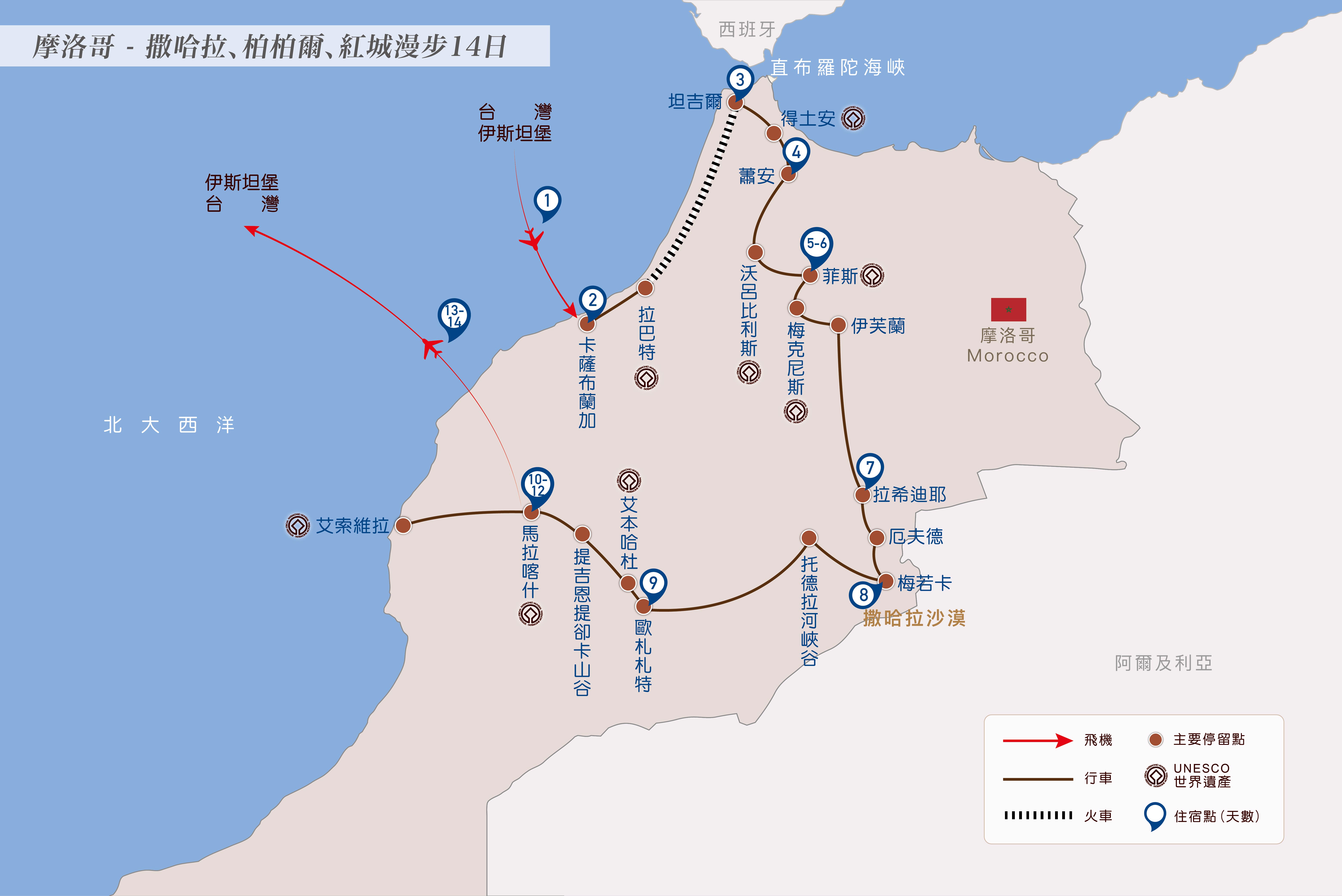 明日自拉巴特搭乘高速鐵路至坦吉爾,行李由巴士載送可能較團員晚抵達飯店,如您想要進飯店時先行盥洗,今晚可準備一換洗包隨行。