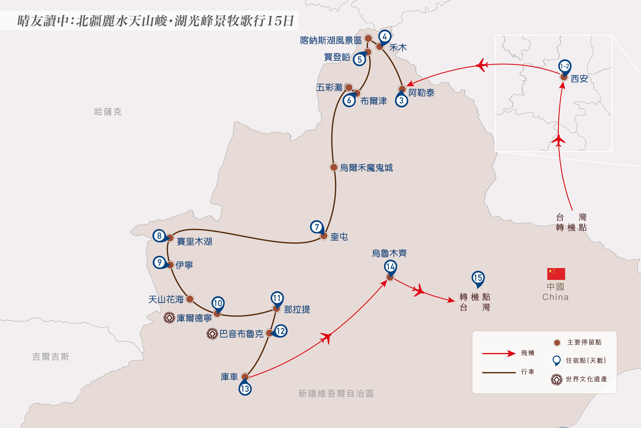 喀納斯、禾木村、白哈巴,此2天採用包車。但如遇景區人流量大,不提供包車,則現退2天包車價差NT4700元/位