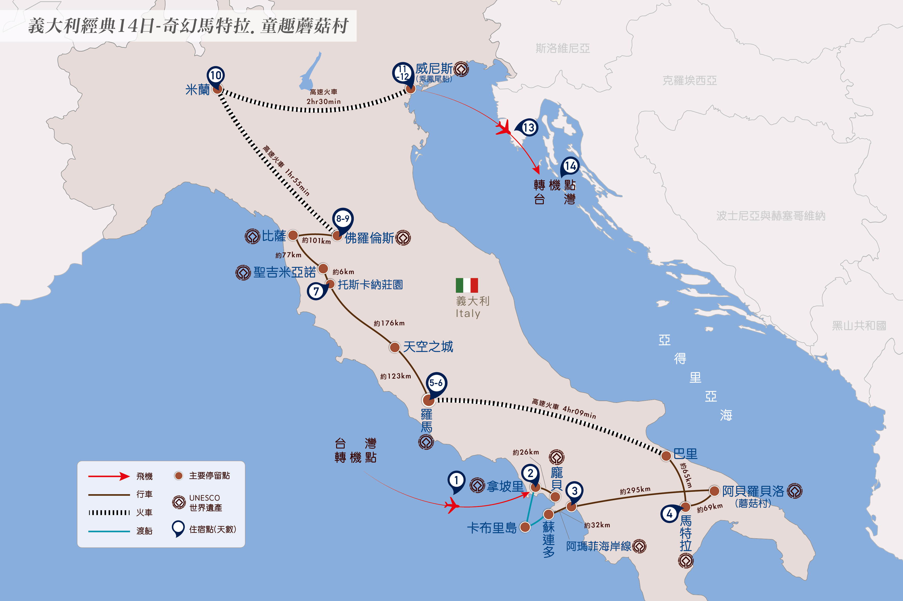 阿瑪菲海岸線-295km-阿貝羅貝洛-69km-馬特拉