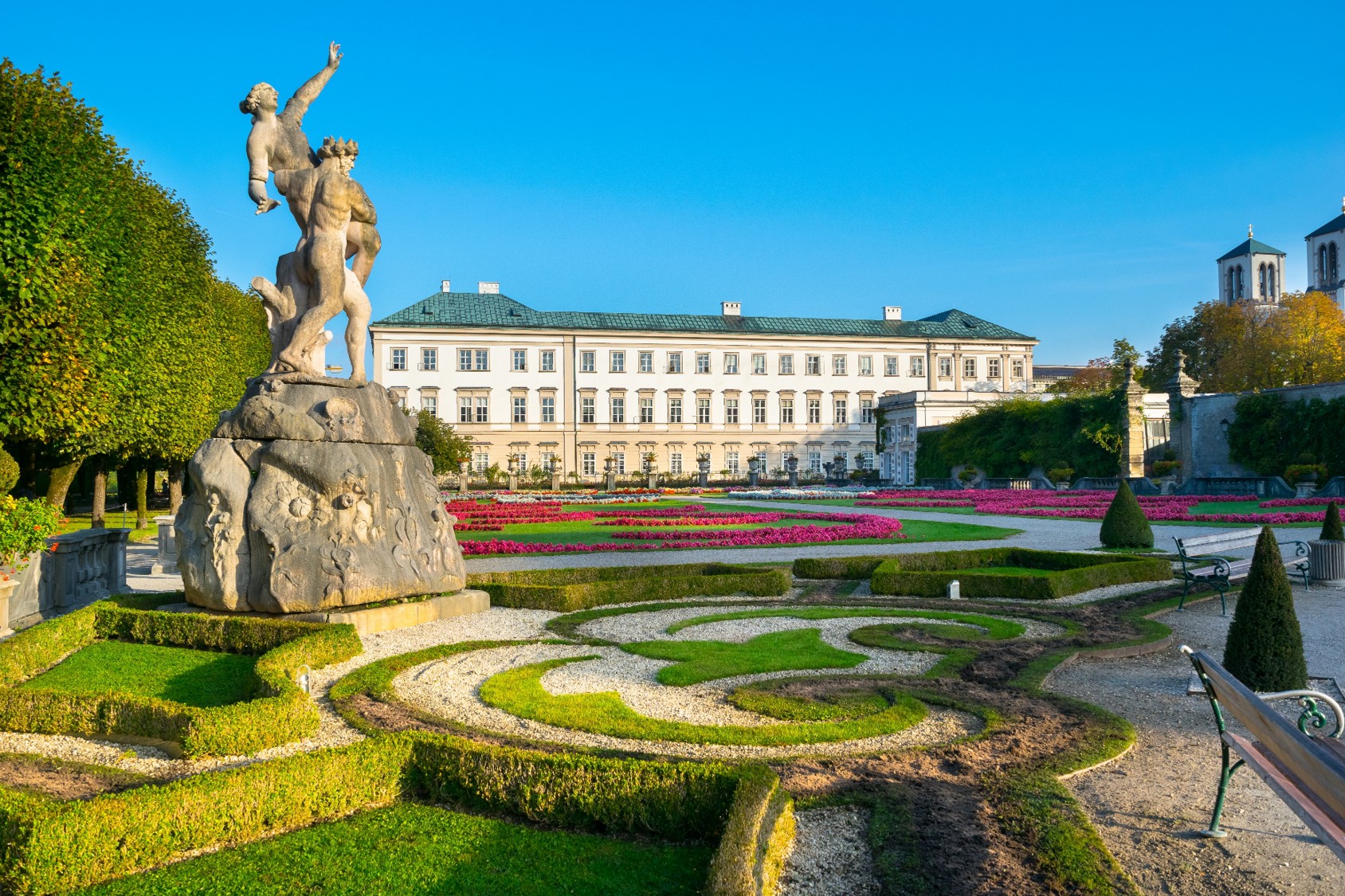 建於1606年,屬於米拉貝爾宮的一部分。這座巴洛克風格花園擁有對稱的花壇、精緻的噴泉、雕塑及矮人花園,花園內的雕塑群靈感來自希臘神話,玫瑰園散發著香氣。這裡是電影《真善美》中的著名拍攝地,經典歌曲《Do-Re-Mi》正是在此拍攝取景。