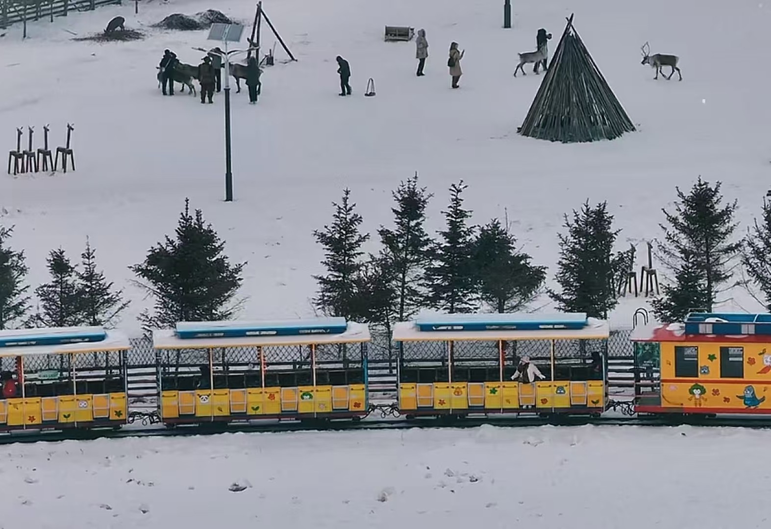 知北村小火車是吉林省通化市梅河口市知北村的特色觀光專案,名為“梅小野號”,是一列充滿卡通感的定制列車,帶你穿梭於復古老街與冰雪世界之間,仿佛進入宮崎駿的童話場景。乘坐小火車可欣賞知北村80年代風格的黃土房、大燈籠、毛驢拉磨等懷舊景觀。
