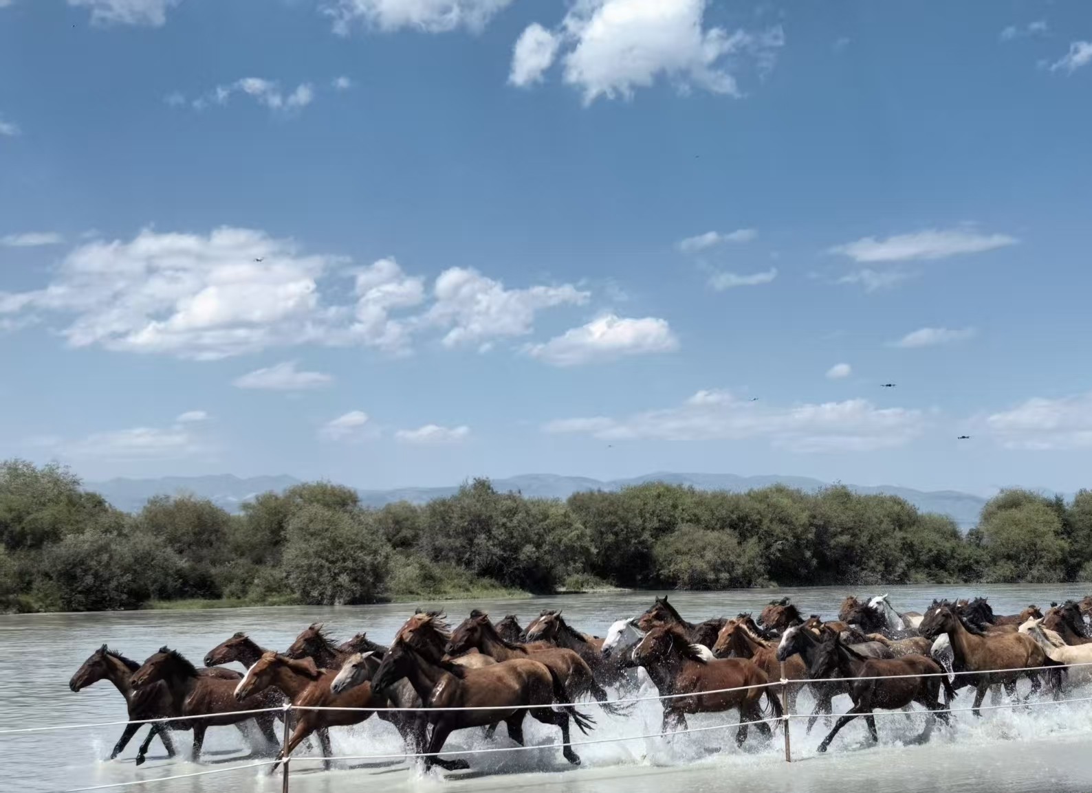 天馬浴河是新疆伊犁哈薩克自治州昭蘇縣在昭蘇濕地公園特克斯河段舉行的大型駿馬奔騰表演景觀,每年4月下旬至10月間上演,上百匹伊犁馬在河中奔騰踏浪,水花飛濺,氣勢磅礴,被譽為“中國天馬之鄉”的史詩級表演。