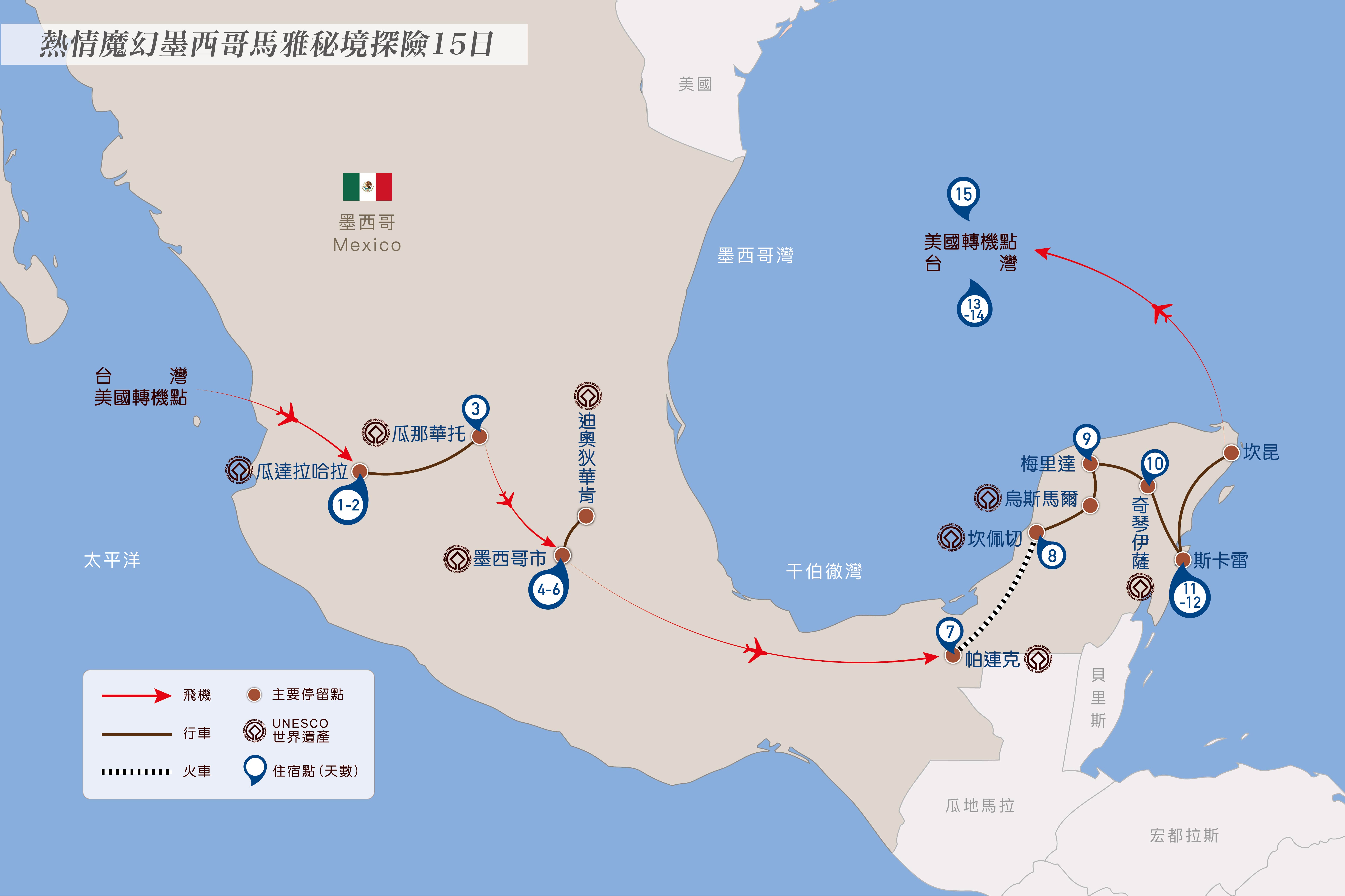 今日前往坎昆,1970 年代迅速發展為加勒比海的國際度假天堂,感受加勒比海浪漫風情,號稱「墨西哥邁阿密」。接著搭乘國際航班前往洛杉磯轉機,展開返鄉回程之路。