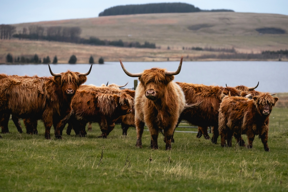 在高地曠野上,您會遇見長毛覆額的高地牛。牠們雖有懾人長角,性情卻異常溫馴。厚重毛皮是抵禦風雨的古老智慧,額前瀏海則溫柔守護雙眼。牠們不僅是風景,更是這片土地上最古老、也最和平的靈魂,以其溫柔的凝視,看盡高地的四季更迭。