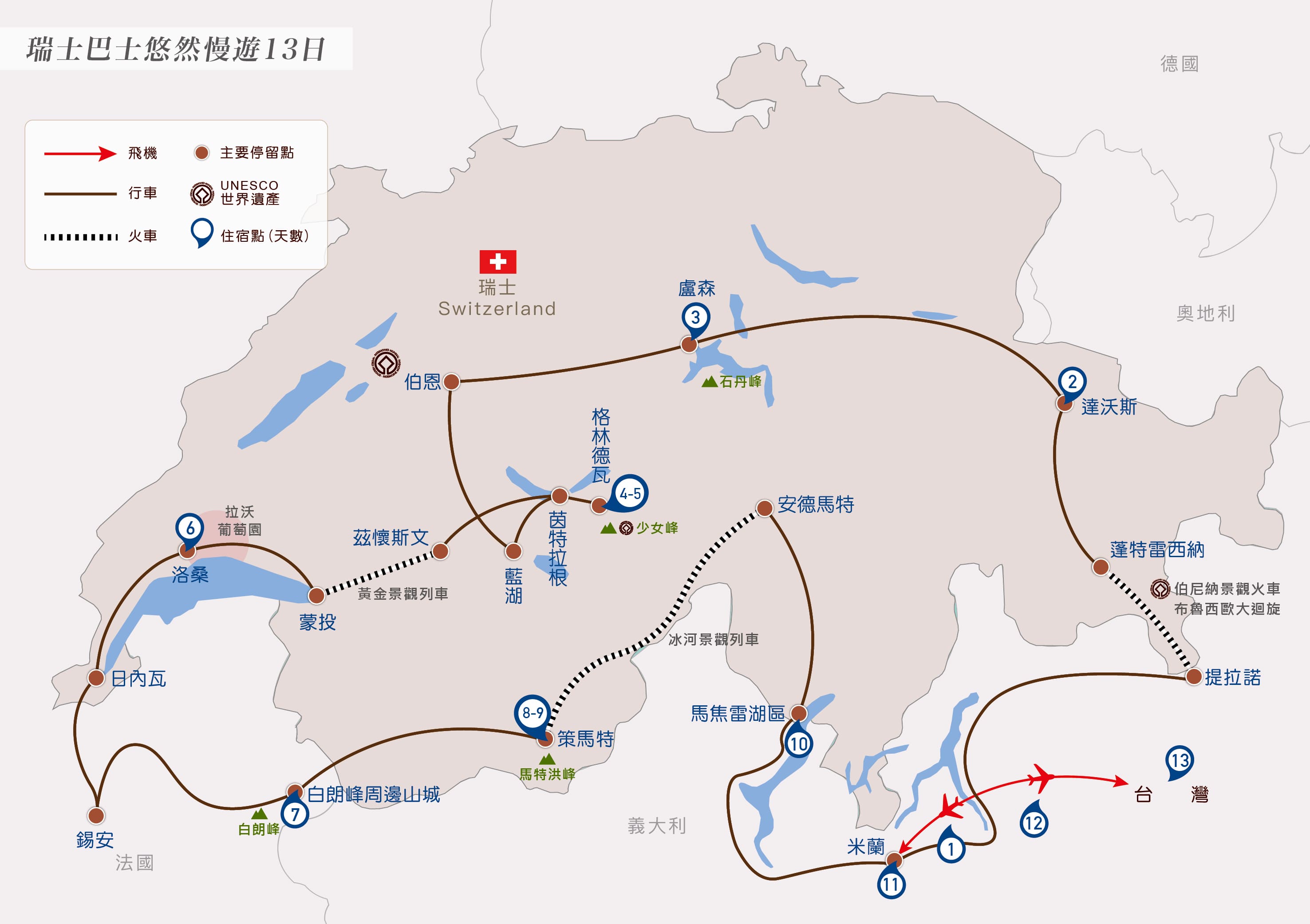 瑞士巴士—悠然慢遊、絕美三大名峰、秘境雙湖13日(BR)